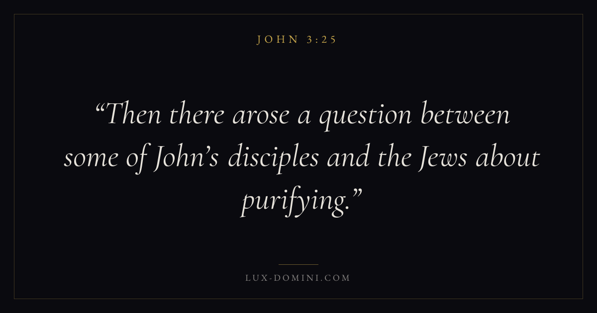 Books / John / Chapter 3 / Verse 25 ← John 3:24 John 3:25 John 3:26 → Then there arose a question between some of John’s disciples and the Jews about purifying. Download verse card Share on Twitter Share on Facebook Pin it ✦ Key themes LoveFaithPeaceTruthIncarnation Read with John 3:26John 3:161 Corinthians 13:4Hebrews 11:1 Related topics Bible verses about loveBible verses about faithBible verses about peaceBible verses about truth ✦ John Chapter 3 verses V. 1 V. 2 V. 3 V. 4 V. 5 V. 6 V. 7 V. 8 V. 9 V. 10 V. 11 V. 12 V. 13 V. 14 V. 15 V. 16 V. 17 V. 18 V. 19 V. 20 V. 21 V. 22 V. 23 V. 24 V. 25 V. 26 V. 27 V. 28 V. 29 V. 30 V. 31 V. 32 V. 33 V. 34 V. 35 V. 36