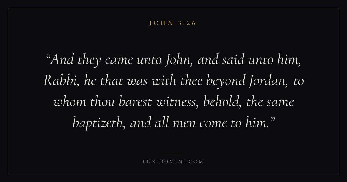 And they came unto John, and said unto him, Rabbi, he that was with thee beyond Jordan, to whom thou barest witness, behold, the same baptizeth, and all men come to him.