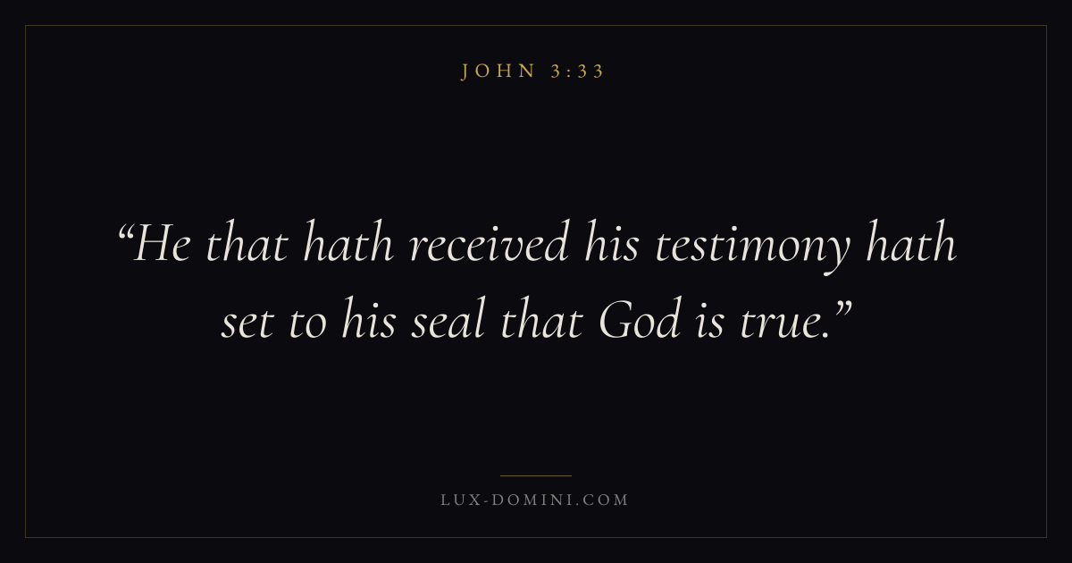 Books / John / Chapter 3 / Verse 33 ← John 3:32 John 3:33 John 3:34 → He that hath received his testimony hath set to his seal that God is true. Download verse card Share on Twitter Share on Facebook Pin it ✦ Key themes LoveFaithPeaceTruthIncarnation Read with John 3:34John 3:161 Corinthians 13:4Hebrews 11:1 Related topics Bible verses about loveBible verses about faithBible verses about peaceBible verses about truth ✦ John Chapter 3 verses V. 1 V. 2 V. 3 V. 4 V. 5 V. 6 V. 7 V. 8 V. 9 V. 10 V. 11 V. 12 V. 13 V. 14 V. 15 V. 16 V. 17 V. 18 V. 19 V. 20 V. 21 V. 22 V. 23 V. 24 V. 25 V. 26 V. 27 V. 28 V. 29 V. 30 V. 31 V. 32 V. 33 V. 34 V. 35 V. 36