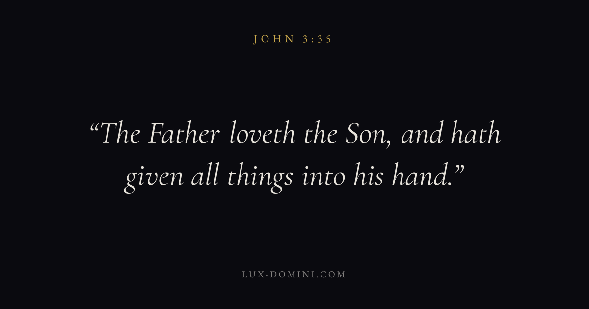 Books / John / Chapter 3 / Verse 35 ← John 3:34 John 3:35 John 3:36 → The Father loveth the Son, and hath given all things into his hand. Download verse card Share on Twitter Share on Facebook Pin it ✦ Key themes LoveFaithPeaceTruthIncarnation Read with John 3:36John 3:161 Corinthians 13:4Hebrews 11:1 Related topics Bible verses about loveBible verses about faithBible verses about peaceBible verses about truth ✦ John Chapter 3 verses V. 1 V. 2 V. 3 V. 4 V. 5 V. 6 V. 7 V. 8 V. 9 V. 10 V. 11 V. 12 V. 13 V. 14 V. 15 V. 16 V. 17 V. 18 V. 19 V. 20 V. 21 V. 22 V. 23 V. 24 V. 25 V. 26 V. 27 V. 28 V. 29 V. 30 V. 31 V. 32 V. 33 V. 34 V. 35 V. 36
