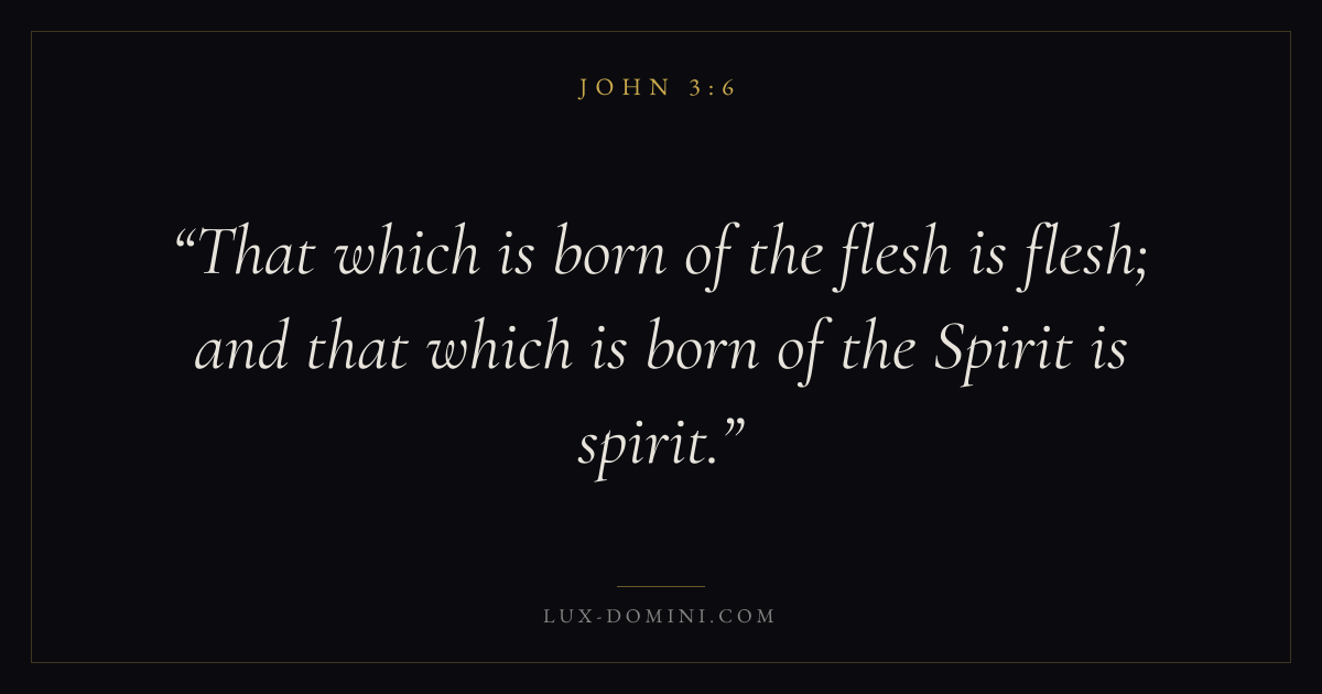 Books / John / Chapter 3 / Verse 6 ← John 3:5 John 3:6 John 3:7 → That which is born of the flesh is flesh; and that which is born of the Spirit is spirit. Download verse card Share on Twitter Share on Facebook Pin it ✦ Key themes LoveFaithAnxiety and fearTruthIncarnation Read with John 3:5John 3:161 Corinthians 13:4Hebrews 11:1 Related topics Bible verses about loveBible verses about faithBible verses about anxiety and fearBible verses about truth ✦ John Chapter 3 verses V. 1 V. 2 V. 3 V. 4 V. 5 V. 6 V. 7 V. 8 V. 9 V. 10 V. 11 V. 12 V. 13 V. 14 V. 15 V. 16 V. 17 V. 18 V. 19 V. 20 V. 21 V. 22 V. 23 V. 24 V. 25 V. 26 V. 27 V. 28 V. 29 V. 30 V. 31 V. 32 V. 33 V. 34 V. 35 V. 36