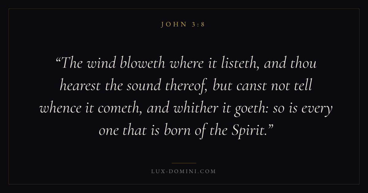 The wind bloweth where it listeth, and thou hearest the sound thereof, but canst not tell whence it cometh, and whither it goeth: so is every one that is born of the Spirit.