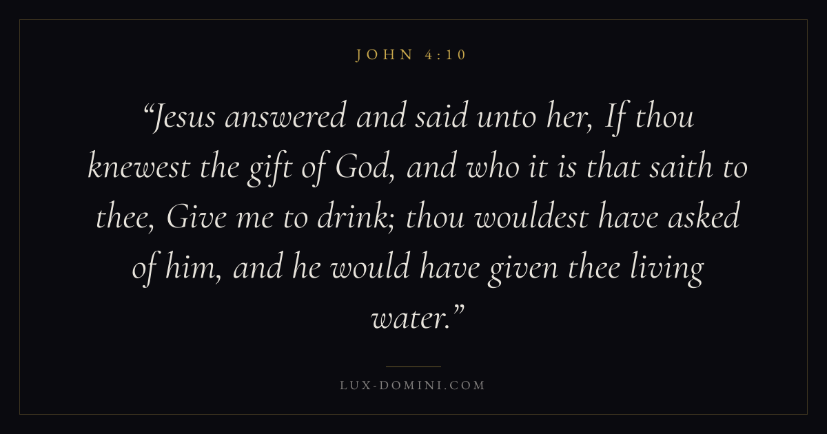 Jesus answered and said unto her, If thou knewest the gift of God, and who it is that saith to thee, Give me to drink; thou wouldest have asked of him, and he would have given thee living water.