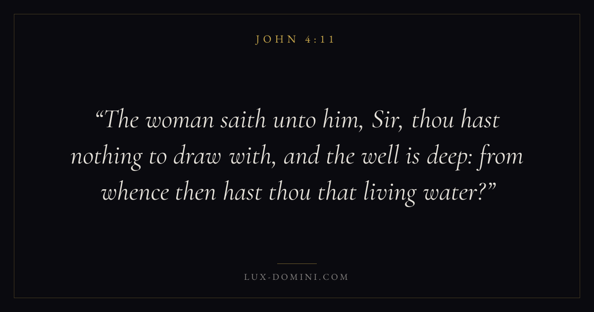The woman saith unto him, Sir, thou hast nothing to draw with, and the well is deep: from whence then hast thou that living water?