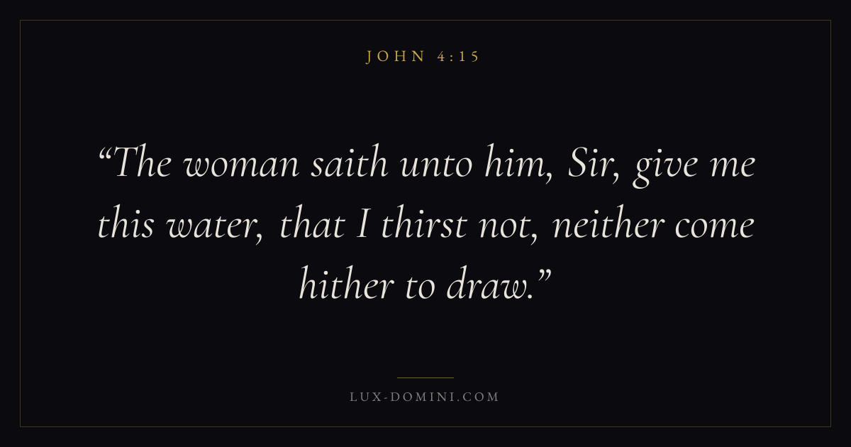 Books / John / Chapter 4 / Verse 15 ← John 4:14 John 4:15 John 4:16 → The woman saith unto him, Sir, give me this water, that I thirst not, neither come hither to draw. Download verse card Share on Twitter Share on Facebook Pin it ✦ Key themes LoveFaithTruthIncarnation Read with John 4:16John 3:161 Corinthians 13:4Hebrews 11:1 Related topics Bible verses about loveBible verses about faithBible verses about truth ✦ John Chapter 4 verses V. 1 V. 2 V. 3 V. 4 V. 5 V. 6 V. 7 V. 8 V. 9 V. 10 V. 11 V. 12 V. 13 V. 14 V. 15 V. 16 V. 17 V. 18 V. 19 V. 20 V. 21 V. 22 V. 23 V. 24 V. 25 V. 26 V. 27 V. 28 V. 29 V. 30 V. 31 V. 32 V. 33 V. 34 V. 35 V. 36 V. 37 V. 38 V. 39 V. 40 V. 41 V. 42 V. 43 V. 44 V. 45 V. 46 V. 47 V. 48 V. 49 V. 50 V. 51 V. 52 V. 53 V. 54