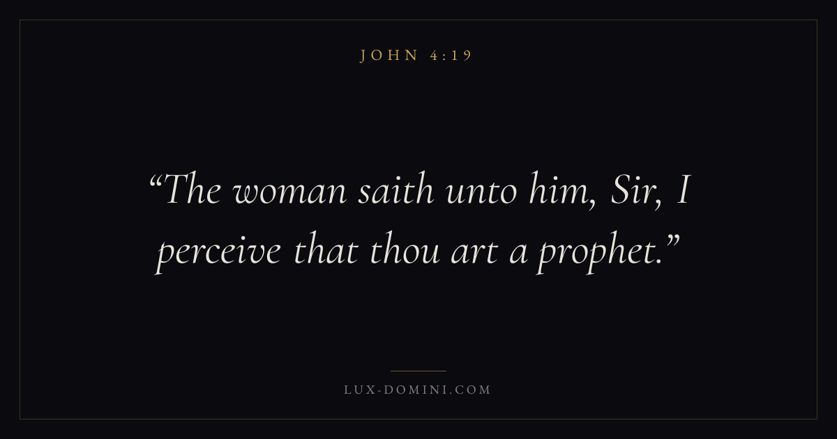 Books / John / Chapter 4 / Verse 19 ← John 4:18 John 4:19 John 4:20 → The woman saith unto him, Sir, I perceive that thou art a prophet. Download verse card Share on Twitter Share on Facebook Pin it ✦ Key themes LoveFaithTruthIncarnation Read with John 4:20John 4:21John 3:161 Corinthians 13:4 Related topics Bible verses about loveBible verses about faithBible verses about truth ✦ John Chapter 4 verses V. 1 V. 2 V. 3 V. 4 V. 5 V. 6 V. 7 V. 8 V. 9 V. 10 V. 11 V. 12 V. 13 V. 14 V. 15 V. 16 V. 17 V. 18 V. 19 V. 20 V. 21 V. 22 V. 23 V. 24 V. 25 V. 26 V. 27 V. 28 V. 29 V. 30 V. 31 V. 32 V. 33 V. 34 V. 35 V. 36 V. 37 V. 38 V. 39 V. 40 V. 41 V. 42 V. 43 V. 44 V. 45 V. 46 V. 47 V. 48 V. 49 V. 50 V. 51 V. 52 V. 53 V. 54