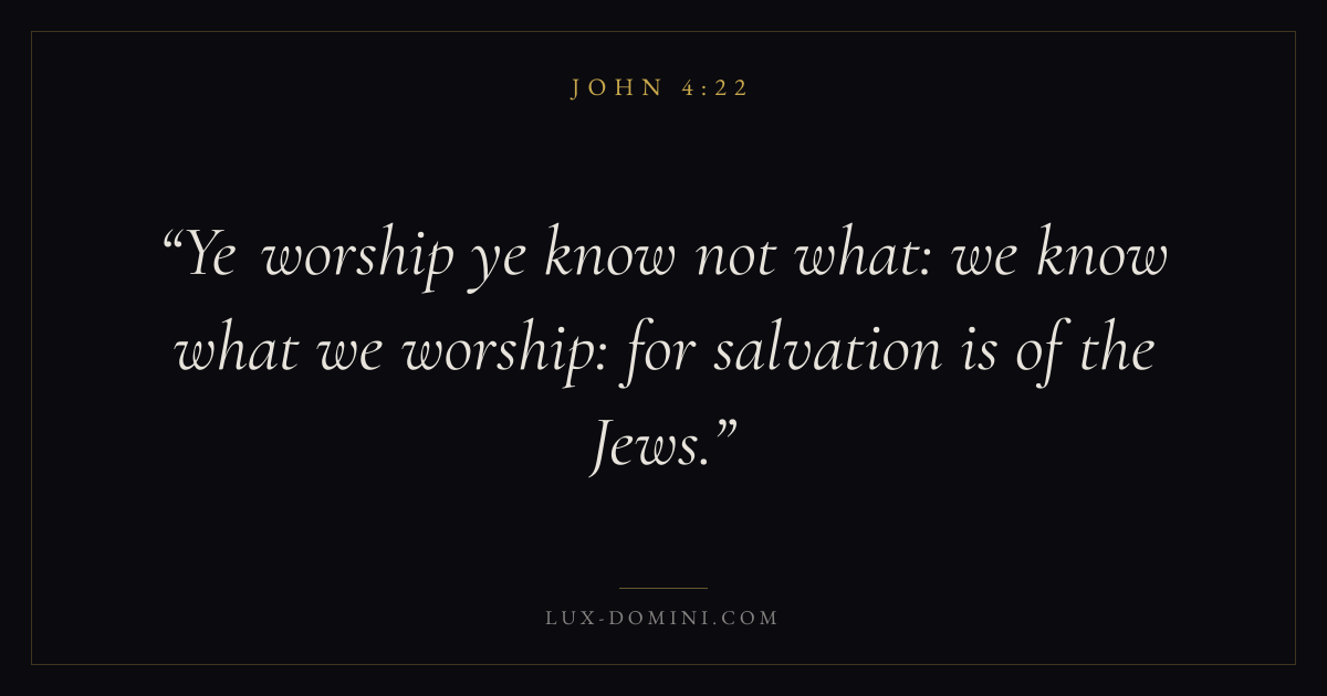 Books / John / Chapter 4 / Verse 22 ← John 4:21 John 4:22 John 4:23 → Ye worship ye know not what: we know what we worship: for salvation is of the Jews. Download verse card Share on Twitter Share on Facebook Pin it ✦ Key themes LoveFaithSalvationTruthIncarnation Read with John 4:23John 3:161 Corinthians 13:4Hebrews 11:1 Related topics Bible verses about loveBible verses about faithBible verses about salvationBible verses about truth ✦ John Chapter 4 verses V. 1 V. 2 V. 3 V. 4 V. 5 V. 6 V. 7 V. 8 V. 9 V. 10 V. 11 V. 12 V. 13 V. 14 V. 15 V. 16 V. 17 V. 18 V. 19 V. 20 V. 21 V. 22 V. 23 V. 24 V. 25 V. 26 V. 27 V. 28 V. 29 V. 30 V. 31 V. 32 V. 33 V. 34 V. 35 V. 36 V. 37 V. 38 V. 39 V. 40 V. 41 V. 42 V. 43 V. 44 V. 45 V. 46 V. 47 V. 48 V. 49 V. 50 V. 51 V. 52 V. 53 V. 54