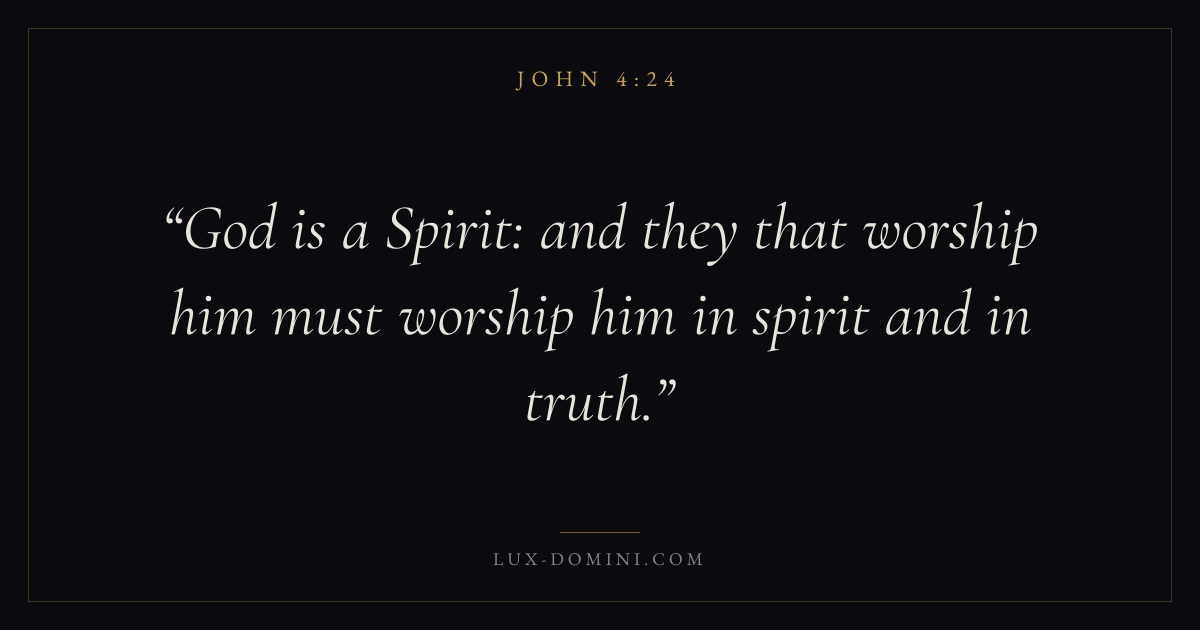 Books / John / Chapter 4 / Verse 24 ← John 4:23 John 4:24 John 4:25 → God is a Spirit: and they that worship him must worship him in spirit and in truth. Download verse card Share on Twitter Share on Facebook Pin it ✦ Key themes LoveFaithTruthIncarnation Read with John 4:25John 4:26John 3:161 Corinthians 13:4 Related topics Bible verses about worshipBible verses about loveBible verses about faithBible verses about truth ✦ John Chapter 4 verses V. 1 V. 2 V. 3 V. 4 V. 5 V. 6 V. 7 V. 8 V. 9 V. 10 V. 11 V. 12 V. 13 V. 14 V. 15 V. 16 V. 17 V. 18 V. 19 V. 20 V. 21 V. 22 V. 23 V. 24 V. 25 V. 26 V. 27 V. 28 V. 29 V. 30 V. 31 V. 32 V. 33 V. 34 V. 35 V. 36 V. 37 V. 38 V. 39 V. 40 V. 41 V. 42 V. 43 V. 44 V. 45 V. 46 V. 47 V. 48 V. 49 V. 50 V. 51 V. 52 V. 53 V. 54