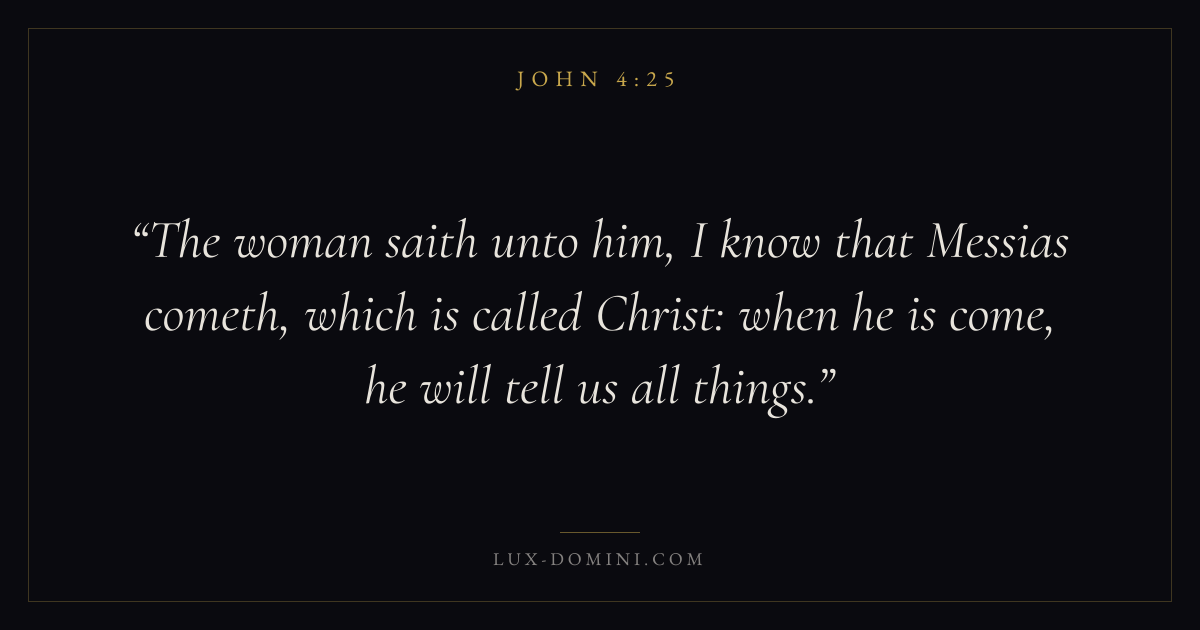 The woman saith unto him, I know that Messias cometh, which is called Christ: when he is come, he will tell us all things.