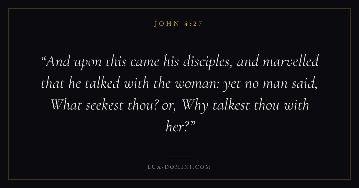 And upon this came his disciples, and marvelled that he talked with the woman: yet no man said, What seekest thou? or, Why talkest thou with her?