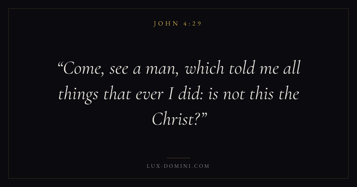 Books / John / Chapter 4 / Verse 29 ← John 4:28 John 4:29 John 4:30 → Come, see a man, which told me all things that ever I did: is not this the Christ? Download verse card Share on Twitter Share on Facebook Pin it ✦ Key themes LoveFaithTruthIncarnation Read with John 4:27John 4:28John 3:161 Corinthians 13:4 Related topics Bible verses about loveBible verses about faithBible verses about truth ✦ John Chapter 4 verses V. 1 V. 2 V. 3 V. 4 V. 5 V. 6 V. 7 V. 8 V. 9 V. 10 V. 11 V. 12 V. 13 V. 14 V. 15 V. 16 V. 17 V. 18 V. 19 V. 20 V. 21 V. 22 V. 23 V. 24 V. 25 V. 26 V. 27 V. 28 V. 29 V. 30 V. 31 V. 32 V. 33 V. 34 V. 35 V. 36 V. 37 V. 38 V. 39 V. 40 V. 41 V. 42 V. 43 V. 44 V. 45 V. 46 V. 47 V. 48 V. 49 V. 50 V. 51 V. 52 V. 53 V. 54