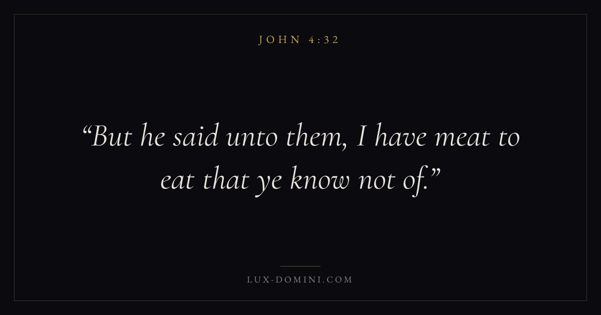 Books / John / Chapter 4 / Verse 32 ← John 4:31 John 4:32 John 4:33 → But he said unto them, I have meat to eat that ye know not of. Download verse card Share on Twitter Share on Facebook Pin it ✦ Key themes LoveFaithTruthIncarnation Read with John 4:31John 4:33John 3:161 Corinthians 13:4 Related topics Bible verses about loveBible verses about faithBible verses about truth ✦ John Chapter 4 verses V. 1 V. 2 V. 3 V. 4 V. 5 V. 6 V. 7 V. 8 V. 9 V. 10 V. 11 V. 12 V. 13 V. 14 V. 15 V. 16 V. 17 V. 18 V. 19 V. 20 V. 21 V. 22 V. 23 V. 24 V. 25 V. 26 V. 27 V. 28 V. 29 V. 30 V. 31 V. 32 V. 33 V. 34 V. 35 V. 36 V. 37 V. 38 V. 39 V. 40 V. 41 V. 42 V. 43 V. 44 V. 45 V. 46 V. 47 V. 48 V. 49 V. 50 V. 51 V. 52 V. 53 V. 54