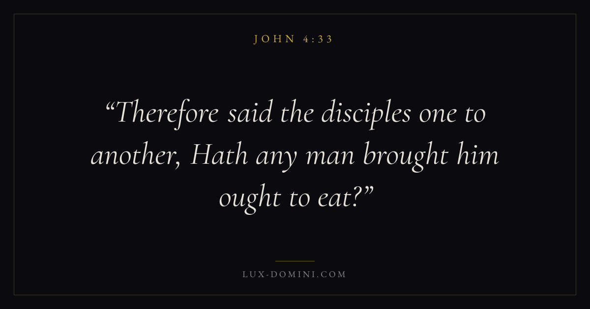 Books / John / Chapter 4 / Verse 33 ← John 4:32 John 4:33 John 4:34 → Therefore said the disciples one to another, Hath any man brought him ought to eat? Download verse card Share on Twitter Share on Facebook Pin it ✦ Key themes LoveFaithTruthIncarnation Read with John 4:31John 4:32John 3:161 Corinthians 13:4 Related topics Bible verses about loveBible verses about faithBible verses about truth ✦ John Chapter 4 verses V. 1 V. 2 V. 3 V. 4 V. 5 V. 6 V. 7 V. 8 V. 9 V. 10 V. 11 V. 12 V. 13 V. 14 V. 15 V. 16 V. 17 V. 18 V. 19 V. 20 V. 21 V. 22 V. 23 V. 24 V. 25 V. 26 V. 27 V. 28 V. 29 V. 30 V. 31 V. 32 V. 33 V. 34 V. 35 V. 36 V. 37 V. 38 V. 39 V. 40 V. 41 V. 42 V. 43 V. 44 V. 45 V. 46 V. 47 V. 48 V. 49 V. 50 V. 51 V. 52 V. 53 V. 54