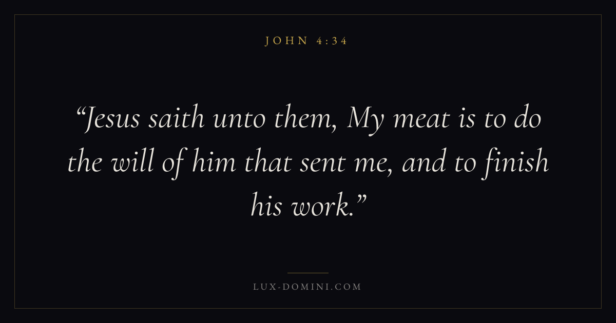 Books / John / Chapter 4 / Verse 34 ← John 4:33 John 4:34 John 4:35 → Jesus saith unto them, My meat is to do the will of him that sent me, and to finish his work. Download verse card Share on Twitter Share on Facebook Pin it ✦ Key themes LoveFaithTruthIncarnation Read with John 4:31John 4:32John 3:161 Corinthians 13:4 Related topics Bible verses about loveBible verses about faithBible verses about truth ✦ John Chapter 4 verses V. 1 V. 2 V. 3 V. 4 V. 5 V. 6 V. 7 V. 8 V. 9 V. 10 V. 11 V. 12 V. 13 V. 14 V. 15 V. 16 V. 17 V. 18 V. 19 V. 20 V. 21 V. 22 V. 23 V. 24 V. 25 V. 26 V. 27 V. 28 V. 29 V. 30 V. 31 V. 32 V. 33 V. 34 V. 35 V. 36 V. 37 V. 38 V. 39 V. 40 V. 41 V. 42 V. 43 V. 44 V. 45 V. 46 V. 47 V. 48 V. 49 V. 50 V. 51 V. 52 V. 53 V. 54