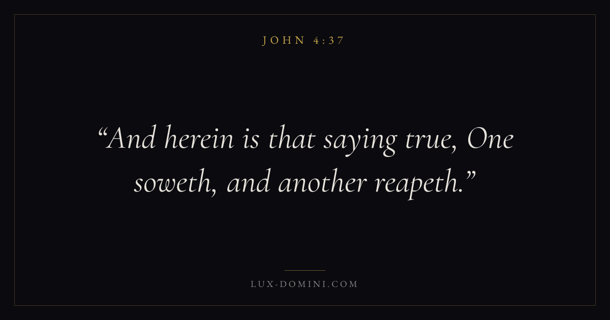 Books / John / Chapter 4 / Verse 37 ← John 4:36 John 4:37 John 4:38 → And herein is that saying true, One soweth, and another reapeth. Download verse card Share on Twitter Share on Facebook Pin it ✦ Key themes LoveFaithTruthIncarnation Read with John 4:35John 4:36John 3:161 Corinthians 13:4 Related topics Bible verses about loveBible verses about faithBible verses about truth ✦ John Chapter 4 verses V. 1 V. 2 V. 3 V. 4 V. 5 V. 6 V. 7 V. 8 V. 9 V. 10 V. 11 V. 12 V. 13 V. 14 V. 15 V. 16 V. 17 V. 18 V. 19 V. 20 V. 21 V. 22 V. 23 V. 24 V. 25 V. 26 V. 27 V. 28 V. 29 V. 30 V. 31 V. 32 V. 33 V. 34 V. 35 V. 36 V. 37 V. 38 V. 39 V. 40 V. 41 V. 42 V. 43 V. 44 V. 45 V. 46 V. 47 V. 48 V. 49 V. 50 V. 51 V. 52 V. 53 V. 54