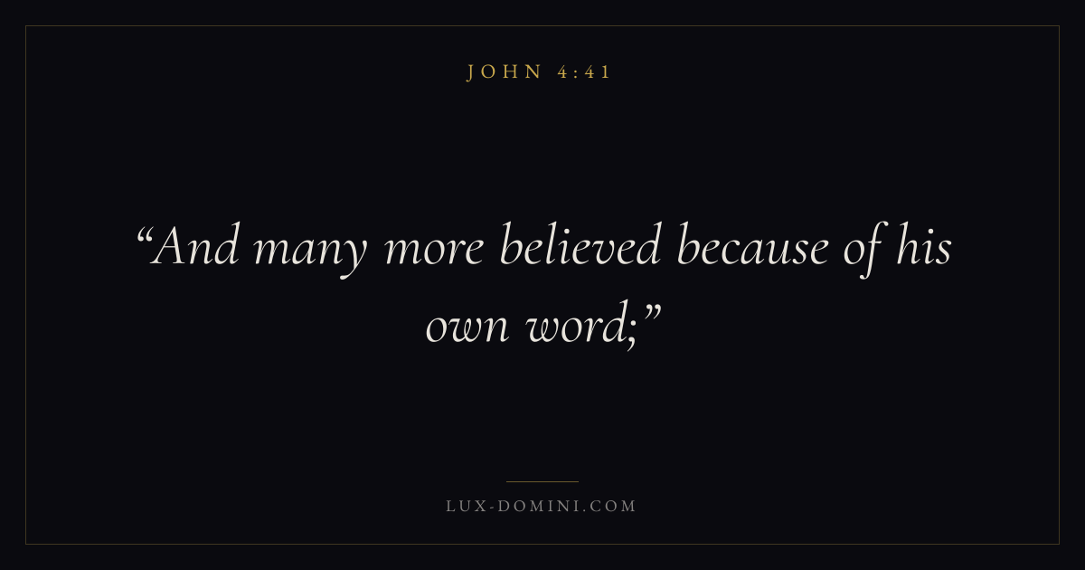 Books / John / Chapter 4 / Verse 41 ← John 4:40 John 4:41 John 4:42 → And many more believed because of his own word; Download verse card Share on Twitter Share on Facebook Pin it ✦ Key themes LoveFaithTruthIncarnation Read with John 4:39John 4:40John 3:161 Corinthians 13:4 Related topics Bible verses about loveBible verses about faithBible verses about truth ✦ John Chapter 4 verses V. 1 V. 2 V. 3 V. 4 V. 5 V. 6 V. 7 V. 8 V. 9 V. 10 V. 11 V. 12 V. 13 V. 14 V. 15 V. 16 V. 17 V. 18 V. 19 V. 20 V. 21 V. 22 V. 23 V. 24 V. 25 V. 26 V. 27 V. 28 V. 29 V. 30 V. 31 V. 32 V. 33 V. 34 V. 35 V. 36 V. 37 V. 38 V. 39 V. 40 V. 41 V. 42 V. 43 V. 44 V. 45 V. 46 V. 47 V. 48 V. 49 V. 50 V. 51 V. 52 V. 53 V. 54