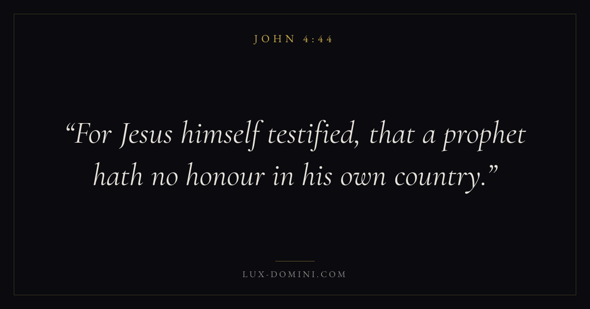 Books / John / Chapter 4 / Verse 44 ← John 4:43 John 4:44 John 4:45 → For Jesus himself testified, that a prophet hath no honour in his own country. Download verse card Share on Twitter Share on Facebook Pin it ✦ Key themes LoveFaithTruthIncarnation Read with John 4:43John 4:45John 3:161 Corinthians 13:4 Related topics Bible verses about loveBible verses about faithBible verses about truth ✦ John Chapter 4 verses V. 1 V. 2 V. 3 V. 4 V. 5 V. 6 V. 7 V. 8 V. 9 V. 10 V. 11 V. 12 V. 13 V. 14 V. 15 V. 16 V. 17 V. 18 V. 19 V. 20 V. 21 V. 22 V. 23 V. 24 V. 25 V. 26 V. 27 V. 28 V. 29 V. 30 V. 31 V. 32 V. 33 V. 34 V. 35 V. 36 V. 37 V. 38 V. 39 V. 40 V. 41 V. 42 V. 43 V. 44 V. 45 V. 46 V. 47 V. 48 V. 49 V. 50 V. 51 V. 52 V. 53 V. 54