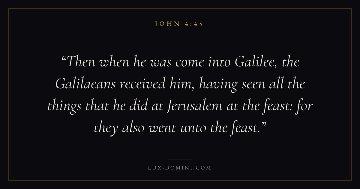 Then when he was come into Galilee, the Galilaeans received him, having seen all the things that he did at Jerusalem at the feast: for they also went unto the feast.