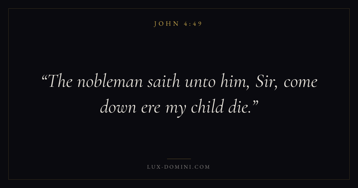 Books / John / Chapter 4 / Verse 49 ← John 4:48 John 4:49 John 4:50 → The nobleman saith unto him, Sir, come down ere my child die. Download verse card Share on Twitter Share on Facebook Pin it ✦ Key themes LoveFaithTruthIncarnation Read with John 4:47John 4:48John 3:161 Corinthians 13:4 Related topics Bible verses about loveBible verses about faithBible verses about truth ✦ John Chapter 4 verses V. 1 V. 2 V. 3 V. 4 V. 5 V. 6 V. 7 V. 8 V. 9 V. 10 V. 11 V. 12 V. 13 V. 14 V. 15 V. 16 V. 17 V. 18 V. 19 V. 20 V. 21 V. 22 V. 23 V. 24 V. 25 V. 26 V. 27 V. 28 V. 29 V. 30 V. 31 V. 32 V. 33 V. 34 V. 35 V. 36 V. 37 V. 38 V. 39 V. 40 V. 41 V. 42 V. 43 V. 44 V. 45 V. 46 V. 47 V. 48 V. 49 V. 50 V. 51 V. 52 V. 53 V. 54