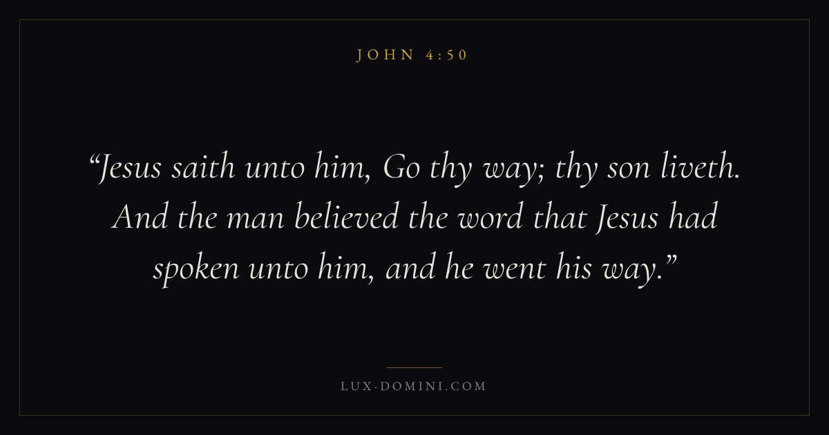 Jesus saith unto him, Go thy way; thy son liveth. And the man believed the word that Jesus had spoken unto him, and he went his way.