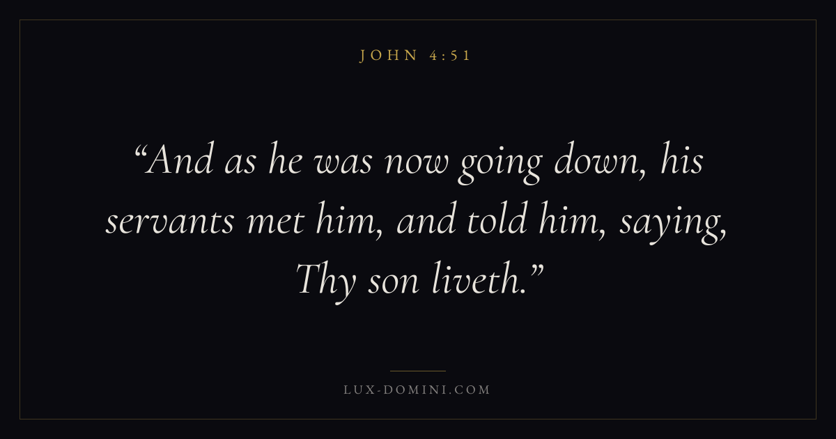 Books / John / Chapter 4 / Verse 51 ← John 4:50 John 4:51 John 4:52 → And as he was now going down, his servants met him, and told him, saying, Thy son liveth. Download verse card Share on Twitter Share on Facebook Pin it ✦ Key themes LoveFaithTruthIncarnation Read with John 4:50John 4:52John 3:161 Corinthians 13:4 Related topics Bible verses about loveBible verses about faithBible verses about truth ✦ John Chapter 4 verses V. 1 V. 2 V. 3 V. 4 V. 5 V. 6 V. 7 V. 8 V. 9 V. 10 V. 11 V. 12 V. 13 V. 14 V. 15 V. 16 V. 17 V. 18 V. 19 V. 20 V. 21 V. 22 V. 23 V. 24 V. 25 V. 26 V. 27 V. 28 V. 29 V. 30 V. 31 V. 32 V. 33 V. 34 V. 35 V. 36 V. 37 V. 38 V. 39 V. 40 V. 41 V. 42 V. 43 V. 44 V. 45 V. 46 V. 47 V. 48 V. 49 V. 50 V. 51 V. 52 V. 53 V. 54