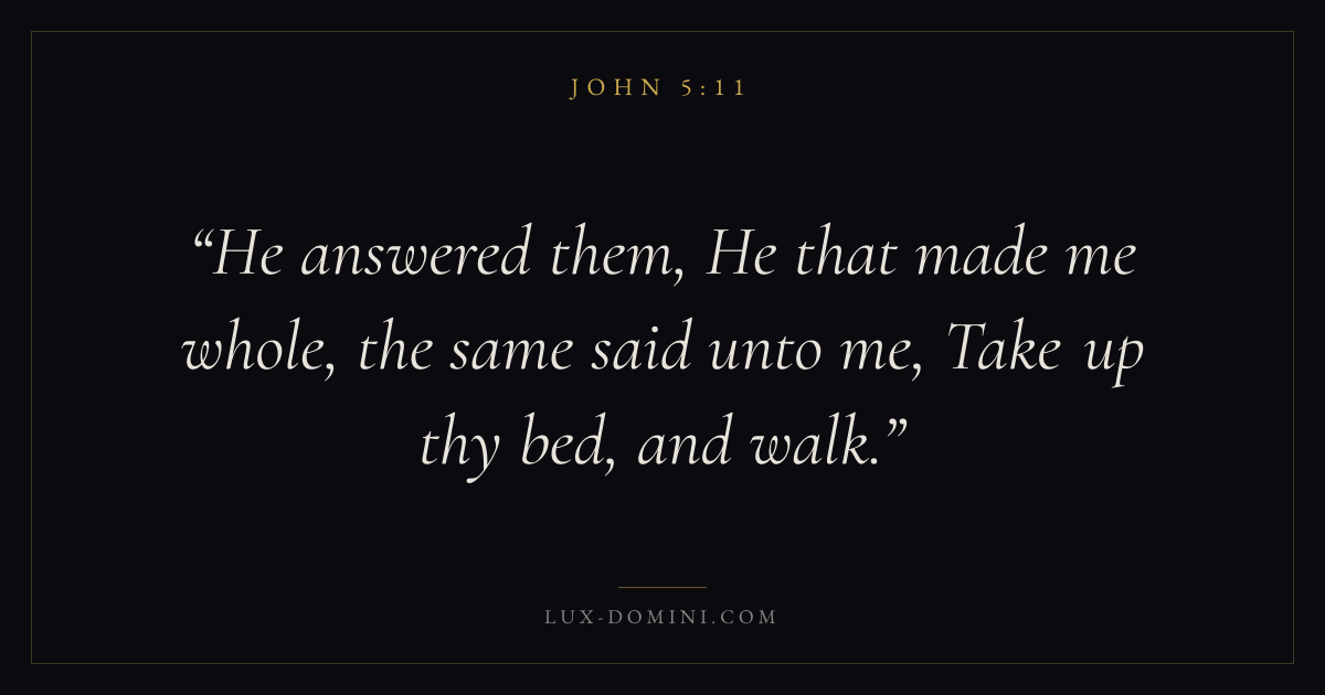 Books / John / Chapter 5 / Verse 11 ← John 5:10 John 5:11 John 5:12 → He answered them, He that made me whole, the same said unto me, Take up thy bed, and walk. Download verse card Share on Twitter Share on Facebook Pin it ✦ Key themes LoveFaithAnxiety and fearGraceIncarnation Read with John 5:10John 5:12John 3:161 Corinthians 13:4 Related topics Bible verses about loveBible verses about faithBible verses about anxiety and fearBible verses about grace ✦ John Chapter 5 verses V. 1 V. 2 V. 3 V. 4 V. 5 V. 6 V. 7 V. 8 V. 9 V. 10 V. 11 V. 12 V. 13 V. 14 V. 15 V. 16 V. 17 V. 18 V. 19 V. 20 V. 21 V. 22 V. 23 V. 24 V. 25 V. 26 V. 27 V. 28 V. 29 V. 30 V. 31 V. 32 V. 33 V. 34 V. 35 V. 36 V. 37 V. 38 V. 39 V. 40 V. 41 V. 42 V. 43 V. 44 V. 45 V. 46 V. 47