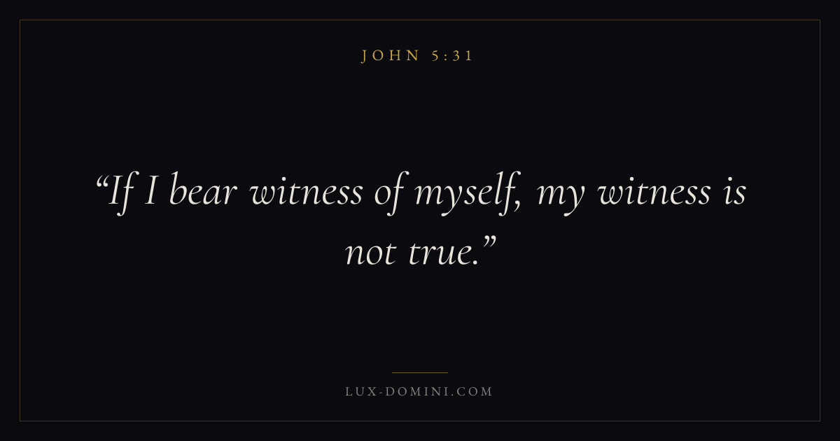Books / John / Chapter 5 / Verse 31 ← John 5:30 John 5:31 John 5:32 → If I bear witness of myself, my witness is not true. Download verse card Share on Twitter Share on Facebook Pin it ✦ Key themes LoveFaithTruthIncarnation Read with John 5:30John 3:161 Corinthians 13:4Hebrews 11:1 Related topics Bible verses about loveBible verses about faithBible verses about truth ✦ John Chapter 5 verses V. 1 V. 2 V. 3 V. 4 V. 5 V. 6 V. 7 V. 8 V. 9 V. 10 V. 11 V. 12 V. 13 V. 14 V. 15 V. 16 V. 17 V. 18 V. 19 V. 20 V. 21 V. 22 V. 23 V. 24 V. 25 V. 26 V. 27 V. 28 V. 29 V. 30 V. 31 V. 32 V. 33 V. 34 V. 35 V. 36 V. 37 V. 38 V. 39 V. 40 V. 41 V. 42 V. 43 V. 44 V. 45 V. 46 V. 47