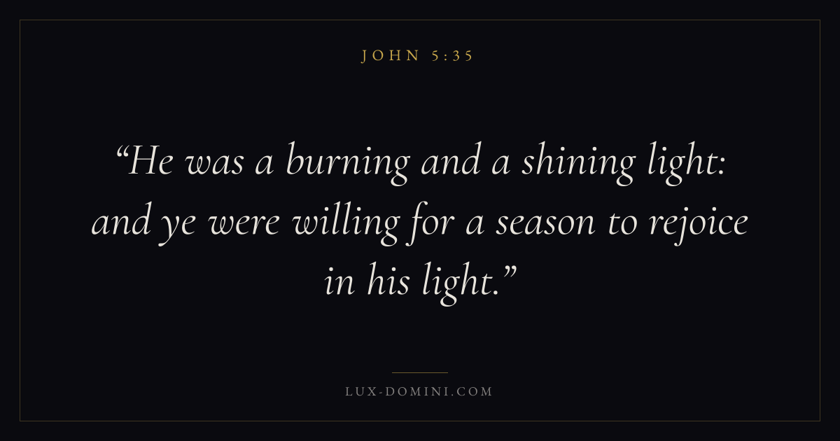 Books / John / Chapter 5 / Verse 35 ← John 5:34 John 5:35 John 5:36 → He was a burning and a shining light: and ye were willing for a season to rejoice in his light. Download verse card Share on Twitter Share on Facebook Pin it ✦ Key themes LoveFaithTruthIncarnation Read with John 5:32John 5:33John 3:161 Corinthians 13:4 Related topics Bible verses about loveBible verses about faithBible verses about truth ✦ John Chapter 5 verses V. 1 V. 2 V. 3 V. 4 V. 5 V. 6 V. 7 V. 8 V. 9 V. 10 V. 11 V. 12 V. 13 V. 14 V. 15 V. 16 V. 17 V. 18 V. 19 V. 20 V. 21 V. 22 V. 23 V. 24 V. 25 V. 26 V. 27 V. 28 V. 29 V. 30 V. 31 V. 32 V. 33 V. 34 V. 35 V. 36 V. 37 V. 38 V. 39 V. 40 V. 41 V. 42 V. 43 V. 44 V. 45 V. 46 V. 47