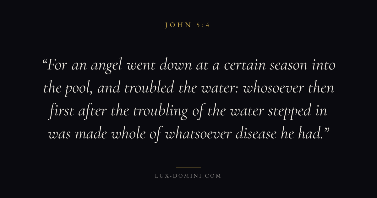 For an angel went down at a certain season into the pool, and troubled the water: whosoever then first after the troubling of the water stepped in was made whole of whatsoever disease he had.