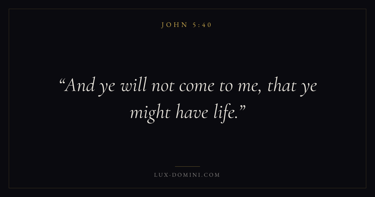 Books / John / Chapter 5 / Verse 40 ← John 5:39 John 5:40 John 5:41 → And ye will not come to me, that ye might have life. Download verse card Share on Twitter Share on Facebook Pin it ✦ Key themes LoveFaithEternal lifeTruthIncarnation Read with John 5:39John 3:161 Corinthians 13:4Hebrews 11:1 Related topics Bible verses about loveBible verses about faithBible verses about eternal lifeBible verses about truth ✦ John Chapter 5 verses V. 1 V. 2 V. 3 V. 4 V. 5 V. 6 V. 7 V. 8 V. 9 V. 10 V. 11 V. 12 V. 13 V. 14 V. 15 V. 16 V. 17 V. 18 V. 19 V. 20 V. 21 V. 22 V. 23 V. 24 V. 25 V. 26 V. 27 V. 28 V. 29 V. 30 V. 31 V. 32 V. 33 V. 34 V. 35 V. 36 V. 37 V. 38 V. 39 V. 40 V. 41 V. 42 V. 43 V. 44 V. 45 V. 46 V. 47
