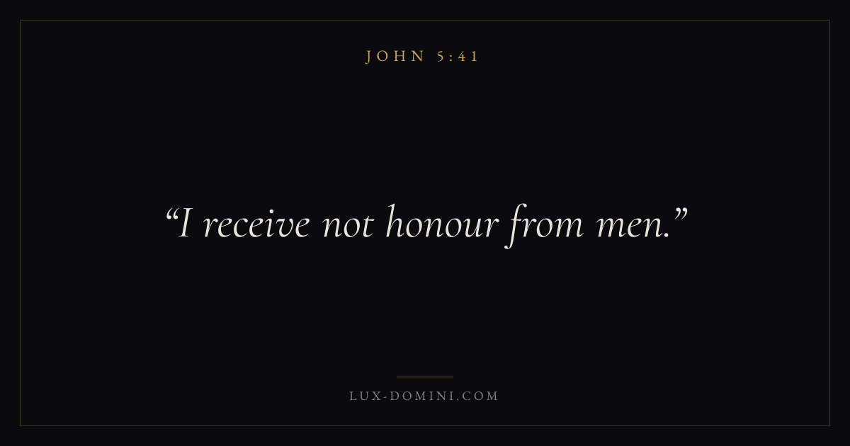 Books / John / Chapter 5 / Verse 41 ← John 5:40 John 5:41 John 5:42 → I receive not honour from men. Download verse card Share on Twitter Share on Facebook Pin it ✦ Key themes LoveFaithEternal lifeTruthIncarnation Read with John 5:42John 3:161 Corinthians 13:4Hebrews 11:1 Related topics Bible verses about loveBible verses about faithBible verses about eternal lifeBible verses about truth ✦ John Chapter 5 verses V. 1 V. 2 V. 3 V. 4 V. 5 V. 6 V. 7 V. 8 V. 9 V. 10 V. 11 V. 12 V. 13 V. 14 V. 15 V. 16 V. 17 V. 18 V. 19 V. 20 V. 21 V. 22 V. 23 V. 24 V. 25 V. 26 V. 27 V. 28 V. 29 V. 30 V. 31 V. 32 V. 33 V. 34 V. 35 V. 36 V. 37 V. 38 V. 39 V. 40 V. 41 V. 42 V. 43 V. 44 V. 45 V. 46 V. 47