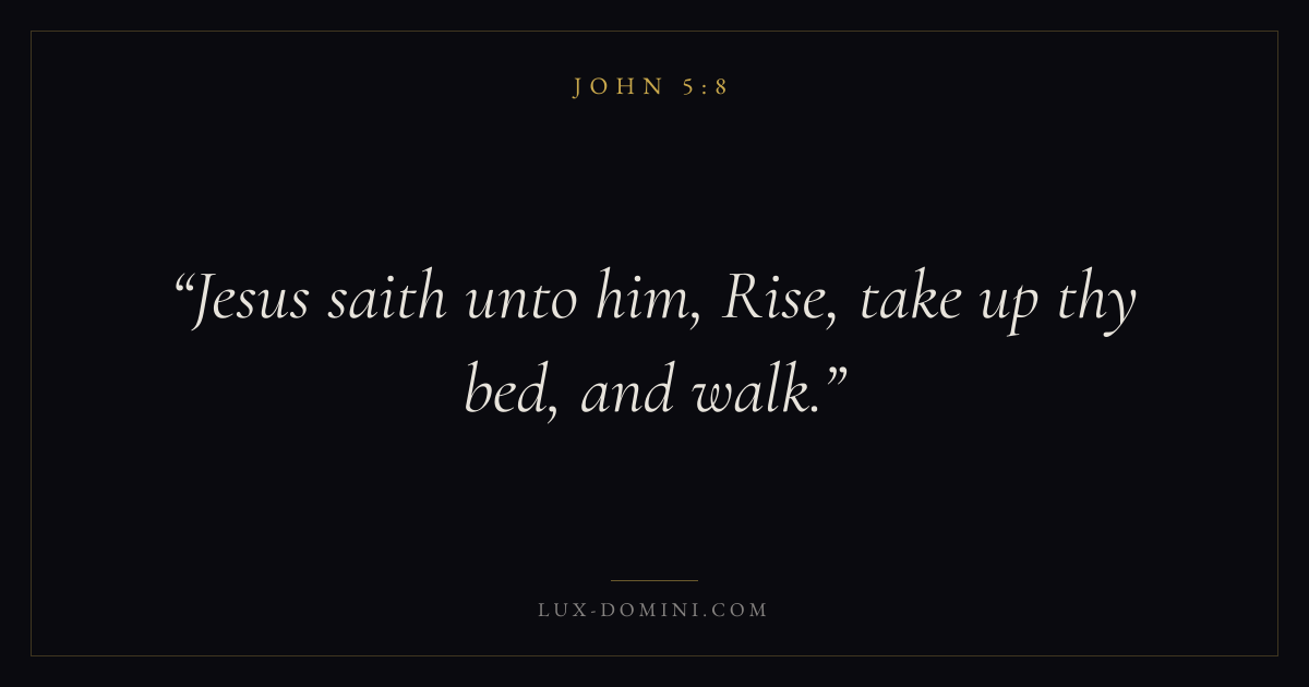 Books / John / Chapter 5 / Verse 8 ← John 5:7 John 5:8 John 5:9 → Jesus saith unto him, Rise, take up thy bed, and walk. Download verse card Share on Twitter Share on Facebook Pin it ✦ Key themes LoveFaithAnxiety and fearTruthIncarnation Read with John 5:9John 3:161 Corinthians 13:4Hebrews 11:1 Related topics Bible verses about loveBible verses about faithBible verses about anxiety and fearBible verses about truth ✦ John Chapter 5 verses V. 1 V. 2 V. 3 V. 4 V. 5 V. 6 V. 7 V. 8 V. 9 V. 10 V. 11 V. 12 V. 13 V. 14 V. 15 V. 16 V. 17 V. 18 V. 19 V. 20 V. 21 V. 22 V. 23 V. 24 V. 25 V. 26 V. 27 V. 28 V. 29 V. 30 V. 31 V. 32 V. 33 V. 34 V. 35 V. 36 V. 37 V. 38 V. 39 V. 40 V. 41 V. 42 V. 43 V. 44 V. 45 V. 46 V. 47