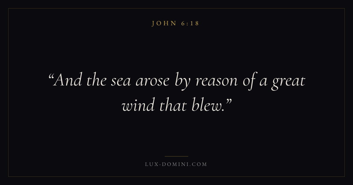 Books / John / Chapter 6 / Verse 18 ← John 6:17 John 6:18 John 6:19 → And the sea arose by reason of a great wind that blew. Download verse card Share on Twitter Share on Facebook Pin it ✦ Key themes LoveFaithTruthIncarnation Read with John 6:15John 6:16John 3:161 Corinthians 13:4 Related topics Bible verses about loveBible verses about faithBible verses about truth ✦ John Chapter 6 verses V. 1 V. 2 V. 3 V. 4 V. 5 V. 6 V. 7 V. 8 V. 9 V. 10 V. 11 V. 12 V. 13 V. 14 V. 15 V. 16 V. 17 V. 18 V. 19 V. 20 V. 21 V. 22 V. 23 V. 24 V. 25 V. 26 V. 27 V. 28 V. 29 V. 30 V. 31 V. 32 V. 33 V. 34 V. 35 V. 36 V. 37 V. 38 V. 39 V. 40 V. 41 V. 42 V. 43 V. 44 V. 45 V. 46 V. 47 V. 48 V. 49 V. 50 V. 51 V. 52 V. 53 V. 54 V. 55 V. 56 V. 57 V. 58 V. 59 V. 60 V. 61 V. 62 V. 63 V. 64 V. 65 V. 66 V. 67 V. 68 V. 69 V. 70 V. 71