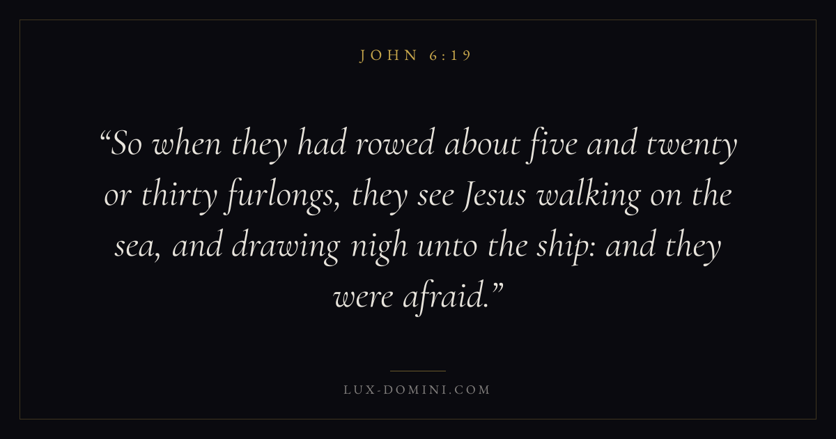 So when they had rowed about five and twenty or thirty furlongs, they see Jesus walking on the sea, and drawing nigh unto the ship: and they were afraid.