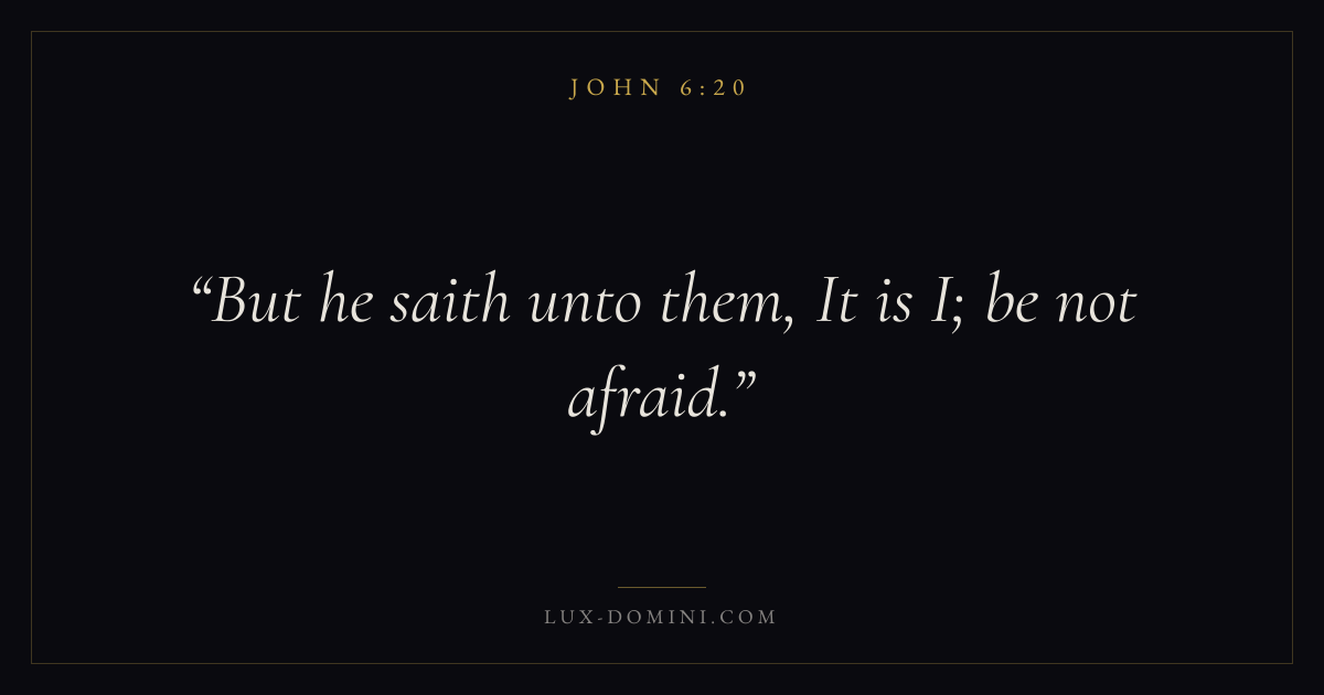 Books / John / Chapter 6 / Verse 20 ← John 6:19 John 6:20 John 6:21 → But he saith unto them, It is I; be not afraid. Download verse card Share on Twitter Share on Facebook Pin it ✦ Key themes LoveFaithAnxiety and fearTruthIncarnation Read with John 6:21John 3:161 Corinthians 13:4Hebrews 11:1 Related topics Bible verses about loveBible verses about faithBible verses about anxiety and fearBible verses about truth ✦ John Chapter 6 verses V. 1 V. 2 V. 3 V. 4 V. 5 V. 6 V. 7 V. 8 V. 9 V. 10 V. 11 V. 12 V. 13 V. 14 V. 15 V. 16 V. 17 V. 18 V. 19 V. 20 V. 21 V. 22 V. 23 V. 24 V. 25 V. 26 V. 27 V. 28 V. 29 V. 30 V. 31 V. 32 V. 33 V. 34 V. 35 V. 36 V. 37 V. 38 V. 39 V. 40 V. 41 V. 42 V. 43 V. 44 V. 45 V. 46 V. 47 V. 48 V. 49 V. 50 V. 51 V. 52 V. 53 V. 54 V. 55 V. 56 V. 57 V. 58 V. 59 V. 60 V. 61 V. 62 V. 63 V. 64 V. 65 V. 66 V. 67 V. 68 V. 69 V. 70 V. 71