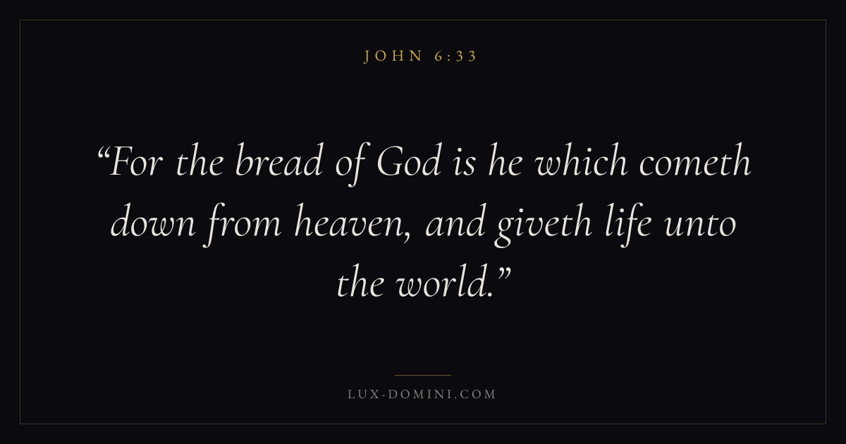 Books / John / Chapter 6 / Verse 33 ← John 6:32 John 6:33 John 6:34 → For the bread of God is he which cometh down from heaven, and giveth life unto the world. Download verse card Share on Twitter Share on Facebook Pin it ✦ Key themes LoveFaithSalvationGraceIncarnation Read with John 6:31John 6:32John 3:161 Corinthians 13:4 Related topics Bible verses about loveBible verses about faithBible verses about salvationBible verses about grace ✦ John Chapter 6 verses V. 1 V. 2 V. 3 V. 4 V. 5 V. 6 V. 7 V. 8 V. 9 V. 10 V. 11 V. 12 V. 13 V. 14 V. 15 V. 16 V. 17 V. 18 V. 19 V. 20 V. 21 V. 22 V. 23 V. 24 V. 25 V. 26 V. 27 V. 28 V. 29 V. 30 V. 31 V. 32 V. 33 V. 34 V. 35 V. 36 V. 37 V. 38 V. 39 V. 40 V. 41 V. 42 V. 43 V. 44 V. 45 V. 46 V. 47 V. 48 V. 49 V. 50 V. 51 V. 52 V. 53 V. 54 V. 55 V. 56 V. 57 V. 58 V. 59 V. 60 V. 61 V. 62 V. 63 V. 64 V. 65 V. 66 V. 67 V. 68 V. 69 V. 70 V. 71