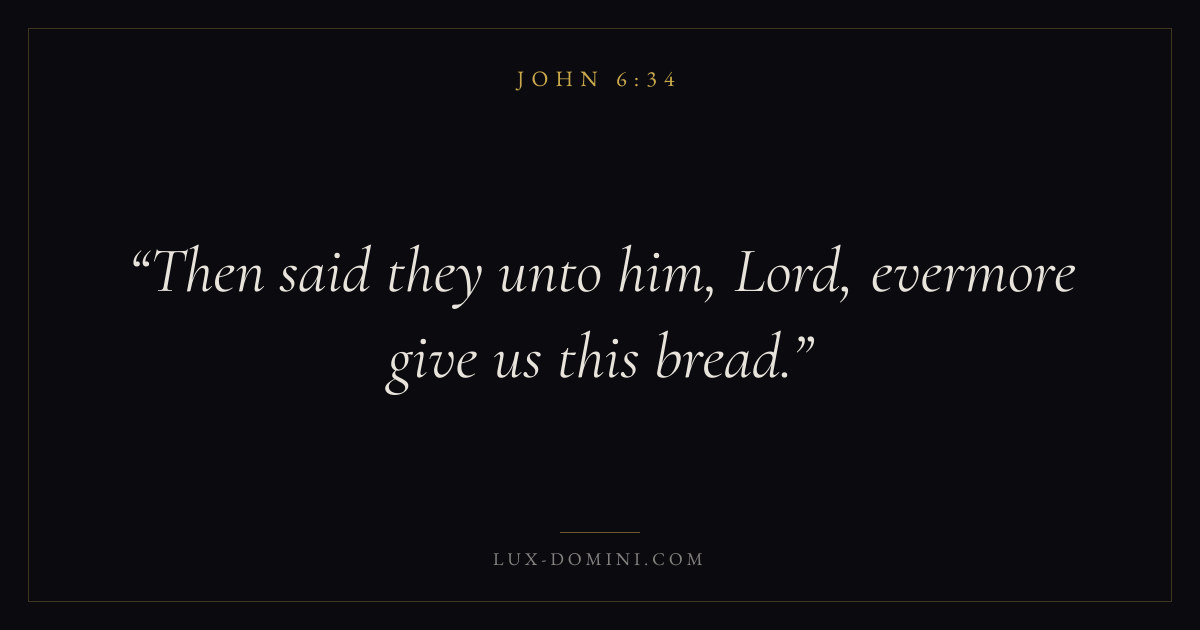 Books / John / Chapter 6 / Verse 34 ← John 6:33 John 6:34 John 6:35 → Then said they unto him, Lord, evermore give us this bread. Download verse card Share on Twitter Share on Facebook Pin it ✦ Key themes LoveFaithSalvationGraceIncarnation Read with John 6:31John 6:32John 3:161 Corinthians 13:4 Related topics Bible verses about loveBible verses about faithBible verses about salvationBible verses about grace ✦ John Chapter 6 verses V. 1 V. 2 V. 3 V. 4 V. 5 V. 6 V. 7 V. 8 V. 9 V. 10 V. 11 V. 12 V. 13 V. 14 V. 15 V. 16 V. 17 V. 18 V. 19 V. 20 V. 21 V. 22 V. 23 V. 24 V. 25 V. 26 V. 27 V. 28 V. 29 V. 30 V. 31 V. 32 V. 33 V. 34 V. 35 V. 36 V. 37 V. 38 V. 39 V. 40 V. 41 V. 42 V. 43 V. 44 V. 45 V. 46 V. 47 V. 48 V. 49 V. 50 V. 51 V. 52 V. 53 V. 54 V. 55 V. 56 V. 57 V. 58 V. 59 V. 60 V. 61 V. 62 V. 63 V. 64 V. 65 V. 66 V. 67 V. 68 V. 69 V. 70 V. 71
