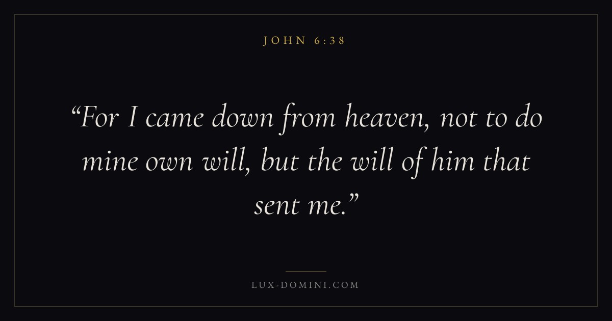 Books / John / Chapter 6 / Verse 38 ← John 6:37 John 6:38 John 6:39 → For I came down from heaven, not to do mine own will, but the will of him that sent me. Download verse card Share on Twitter Share on Facebook Pin it ✦ Key themes LoveFaithSalvationTruthIncarnation Read with John 6:36John 6:37John 3:161 Corinthians 13:4 Related topics Bible verses about loveBible verses about faithBible verses about salvationBible verses about truth ✦ John Chapter 6 verses V. 1 V. 2 V. 3 V. 4 V. 5 V. 6 V. 7 V. 8 V. 9 V. 10 V. 11 V. 12 V. 13 V. 14 V. 15 V. 16 V. 17 V. 18 V. 19 V. 20 V. 21 V. 22 V. 23 V. 24 V. 25 V. 26 V. 27 V. 28 V. 29 V. 30 V. 31 V. 32 V. 33 V. 34 V. 35 V. 36 V. 37 V. 38 V. 39 V. 40 V. 41 V. 42 V. 43 V. 44 V. 45 V. 46 V. 47 V. 48 V. 49 V. 50 V. 51 V. 52 V. 53 V. 54 V. 55 V. 56 V. 57 V. 58 V. 59 V. 60 V. 61 V. 62 V. 63 V. 64 V. 65 V. 66 V. 67 V. 68 V. 69 V. 70 V. 71