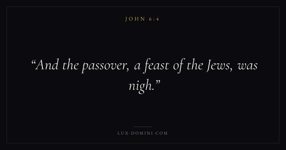 Books / John / Chapter 6 / Verse 4 ← John 6:3 John 6:4 John 6:5 → And the passover, a feast of the Jews, was nigh. Download verse card Share on Twitter Share on Facebook Pin it ✦ Key themes LoveFaithTruthIncarnation Read with John 6:1John 6:2John 3:161 Corinthians 13:4 Related topics Bible verses about loveBible verses about faithBible verses about truth ✦ John Chapter 6 verses V. 1 V. 2 V. 3 V. 4 V. 5 V. 6 V. 7 V. 8 V. 9 V. 10 V. 11 V. 12 V. 13 V. 14 V. 15 V. 16 V. 17 V. 18 V. 19 V. 20 V. 21 V. 22 V. 23 V. 24 V. 25 V. 26 V. 27 V. 28 V. 29 V. 30 V. 31 V. 32 V. 33 V. 34 V. 35 V. 36 V. 37 V. 38 V. 39 V. 40 V. 41 V. 42 V. 43 V. 44 V. 45 V. 46 V. 47 V. 48 V. 49 V. 50 V. 51 V. 52 V. 53 V. 54 V. 55 V. 56 V. 57 V. 58 V. 59 V. 60 V. 61 V. 62 V. 63 V. 64 V. 65 V. 66 V. 67 V. 68 V. 69 V. 70 V. 71