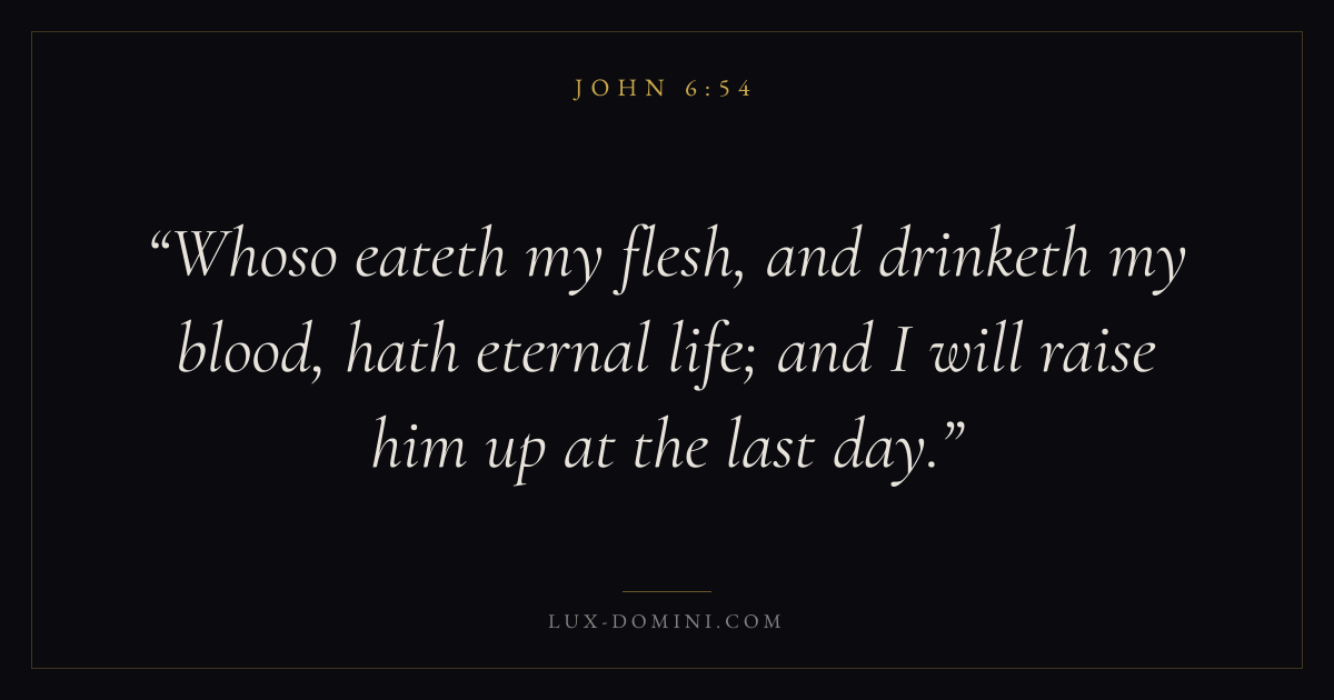 Whoso eateth my flesh, and drinketh my blood, hath eternal life; and I will raise him up at the last day.