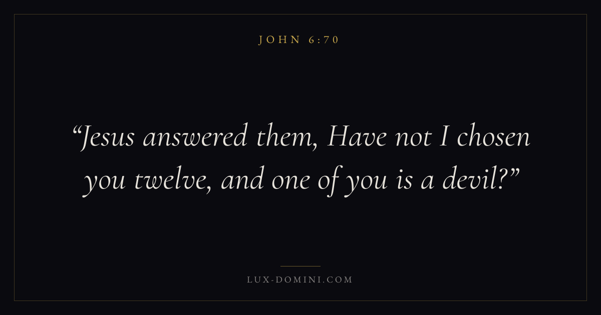 Books / John / Chapter 6 / Verse 70 ← John 6:69 John 6:70 John 6:71 → Jesus answered them, Have not I chosen you twelve, and one of you is a devil? Download verse card Share on Twitter Share on Facebook Pin it ✦ Key themes LoveFaithJustice and mercyTruthIncarnation Read with John 6:71John 3:161 Corinthians 13:4Hebrews 11:1 Related topics Bible verses about loveBible verses about faithBible verses about justice and mercyBible verses about truth ✦ John Chapter 6 verses V. 1 V. 2 V. 3 V. 4 V. 5 V. 6 V. 7 V. 8 V. 9 V. 10 V. 11 V. 12 V. 13 V. 14 V. 15 V. 16 V. 17 V. 18 V. 19 V. 20 V. 21 V. 22 V. 23 V. 24 V. 25 V. 26 V. 27 V. 28 V. 29 V. 30 V. 31 V. 32 V. 33 V. 34 V. 35 V. 36 V. 37 V. 38 V. 39 V. 40 V. 41 V. 42 V. 43 V. 44 V. 45 V. 46 V. 47 V. 48 V. 49 V. 50 V. 51 V. 52 V. 53 V. 54 V. 55 V. 56 V. 57 V. 58 V. 59 V. 60 V. 61 V. 62 V. 63 V. 64 V. 65 V. 66 V. 67 V. 68 V. 69 V. 70 V. 71