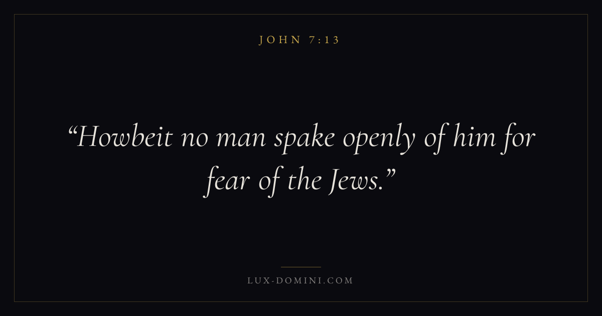 Books / John / Chapter 7 / Verse 13 ← John 7:12 John 7:13 John 7:14 → Howbeit no man spake openly of him for fear of the Jews. Download verse card Share on Twitter Share on Facebook Pin it ✦ Key themes LoveFaithAnxiety and fearTruthIncarnation Read with John 7:10John 7:11John 3:161 Corinthians 13:4 Related topics Bible verses about loveBible verses about faithBible verses about anxiety and fearBible verses about truth ✦ John Chapter 7 verses V. 1 V. 2 V. 3 V. 4 V. 5 V. 6 V. 7 V. 8 V. 9 V. 10 V. 11 V. 12 V. 13 V. 14 V. 15 V. 16 V. 17 V. 18 V. 19 V. 20 V. 21 V. 22 V. 23 V. 24 V. 25 V. 26 V. 27 V. 28 V. 29 V. 30 V. 31 V. 32 V. 33 V. 34 V. 35 V. 36 V. 37 V. 38 V. 39 V. 40 V. 41 V. 42 V. 43 V. 44 V. 45 V. 46 V. 47 V. 48 V. 49 V. 50 V. 51 V. 52 V. 53