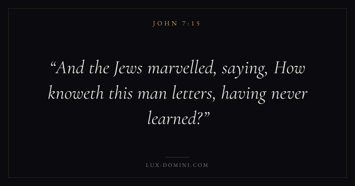 Books / John / Chapter 7 / Verse 15 ← John 7:14 John 7:15 John 7:16 → And the Jews marvelled, saying, How knoweth this man letters, having never learned? Download verse card Share on Twitter Share on Facebook Pin it ✦ Key themes LoveFaithTruthIncarnation Read with John 7:14John 3:161 Corinthians 13:4Hebrews 11:1 Related topics Bible verses about loveBible verses about faithBible verses about truth ✦ John Chapter 7 verses V. 1 V. 2 V. 3 V. 4 V. 5 V. 6 V. 7 V. 8 V. 9 V. 10 V. 11 V. 12 V. 13 V. 14 V. 15 V. 16 V. 17 V. 18 V. 19 V. 20 V. 21 V. 22 V. 23 V. 24 V. 25 V. 26 V. 27 V. 28 V. 29 V. 30 V. 31 V. 32 V. 33 V. 34 V. 35 V. 36 V. 37 V. 38 V. 39 V. 40 V. 41 V. 42 V. 43 V. 44 V. 45 V. 46 V. 47 V. 48 V. 49 V. 50 V. 51 V. 52 V. 53