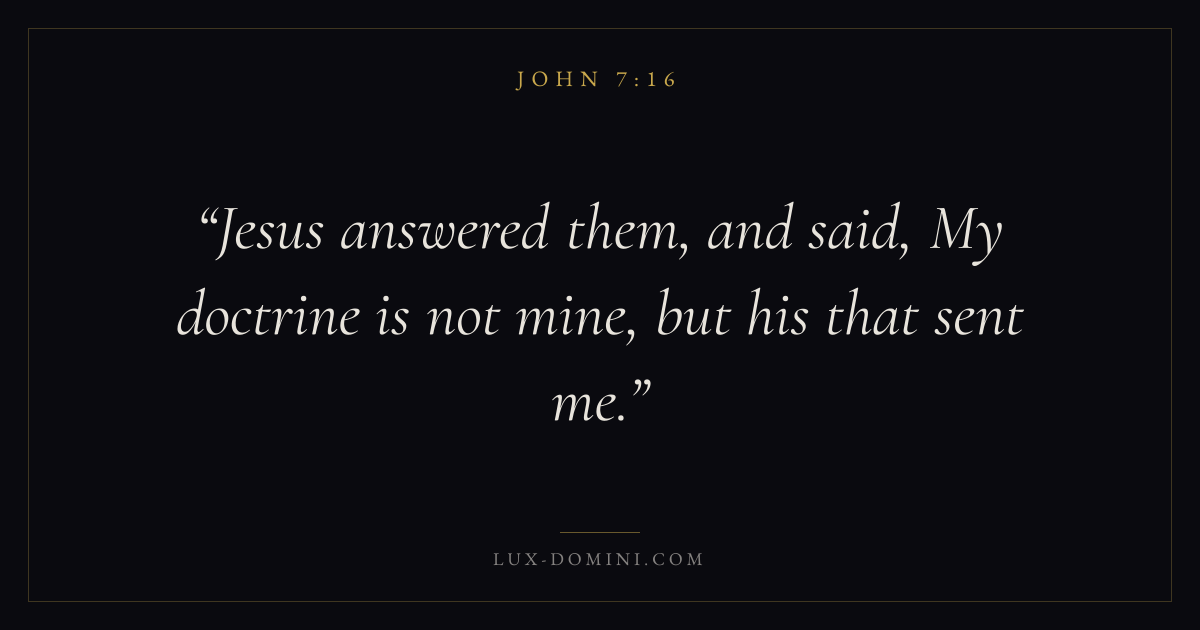 Books / John / Chapter 7 / Verse 16 ← John 7:15 John 7:16 John 7:17 → Jesus answered them, and said, My doctrine is not mine, but his that sent me. Download verse card Share on Twitter Share on Facebook Pin it ✦ Key themes LoveFaithTruthIncarnation Read with John 7:17John 3:161 Corinthians 13:4Hebrews 11:1 Related topics Bible verses about loveBible verses about faithBible verses about truth ✦ John Chapter 7 verses V. 1 V. 2 V. 3 V. 4 V. 5 V. 6 V. 7 V. 8 V. 9 V. 10 V. 11 V. 12 V. 13 V. 14 V. 15 V. 16 V. 17 V. 18 V. 19 V. 20 V. 21 V. 22 V. 23 V. 24 V. 25 V. 26 V. 27 V. 28 V. 29 V. 30 V. 31 V. 32 V. 33 V. 34 V. 35 V. 36 V. 37 V. 38 V. 39 V. 40 V. 41 V. 42 V. 43 V. 44 V. 45 V. 46 V. 47 V. 48 V. 49 V. 50 V. 51 V. 52 V. 53