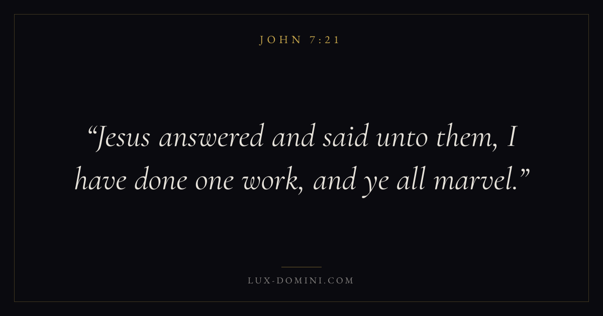 Books / John / Chapter 7 / Verse 21 ← John 7:20 John 7:21 John 7:22 → Jesus answered and said unto them, I have done one work, and ye all marvel. Download verse card Share on Twitter Share on Facebook Pin it ✦ Key themes LoveFaithTruthIncarnation Read with John 7:20John 3:161 Corinthians 13:4Hebrews 11:1 Related topics Bible verses about loveBible verses about faithBible verses about truth ✦ John Chapter 7 verses V. 1 V. 2 V. 3 V. 4 V. 5 V. 6 V. 7 V. 8 V. 9 V. 10 V. 11 V. 12 V. 13 V. 14 V. 15 V. 16 V. 17 V. 18 V. 19 V. 20 V. 21 V. 22 V. 23 V. 24 V. 25 V. 26 V. 27 V. 28 V. 29 V. 30 V. 31 V. 32 V. 33 V. 34 V. 35 V. 36 V. 37 V. 38 V. 39 V. 40 V. 41 V. 42 V. 43 V. 44 V. 45 V. 46 V. 47 V. 48 V. 49 V. 50 V. 51 V. 52 V. 53