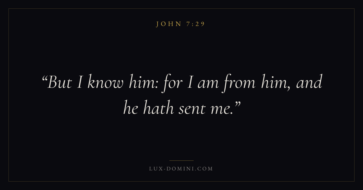 Books / John / Chapter 7 / Verse 29 ← John 7:28 John 7:29 John 7:30 → But I know him: for I am from him, and he hath sent me. Download verse card Share on Twitter Share on Facebook Pin it ✦ Key themes LoveFaithTruthIncarnation Read with John 7:27John 7:28John 3:161 Corinthians 13:4 Related topics Bible verses about loveBible verses about faithBible verses about truth ✦ John Chapter 7 verses V. 1 V. 2 V. 3 V. 4 V. 5 V. 6 V. 7 V. 8 V. 9 V. 10 V. 11 V. 12 V. 13 V. 14 V. 15 V. 16 V. 17 V. 18 V. 19 V. 20 V. 21 V. 22 V. 23 V. 24 V. 25 V. 26 V. 27 V. 28 V. 29 V. 30 V. 31 V. 32 V. 33 V. 34 V. 35 V. 36 V. 37 V. 38 V. 39 V. 40 V. 41 V. 42 V. 43 V. 44 V. 45 V. 46 V. 47 V. 48 V. 49 V. 50 V. 51 V. 52 V. 53