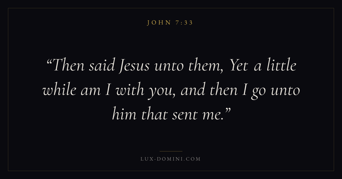 Books / John / Chapter 7 / Verse 33 ← John 7:32 John 7:33 John 7:34 → Then said Jesus unto them, Yet a little while am I with you, and then I go unto him that sent me. Download verse card Share on Twitter Share on Facebook Pin it ✦ Key themes LoveFaithTruthIncarnation Read with John 7:32John 3:161 Corinthians 13:4Hebrews 11:1 Related topics Bible verses about loveBible verses about faithBible verses about truth ✦ John Chapter 7 verses V. 1 V. 2 V. 3 V. 4 V. 5 V. 6 V. 7 V. 8 V. 9 V. 10 V. 11 V. 12 V. 13 V. 14 V. 15 V. 16 V. 17 V. 18 V. 19 V. 20 V. 21 V. 22 V. 23 V. 24 V. 25 V. 26 V. 27 V. 28 V. 29 V. 30 V. 31 V. 32 V. 33 V. 34 V. 35 V. 36 V. 37 V. 38 V. 39 V. 40 V. 41 V. 42 V. 43 V. 44 V. 45 V. 46 V. 47 V. 48 V. 49 V. 50 V. 51 V. 52 V. 53