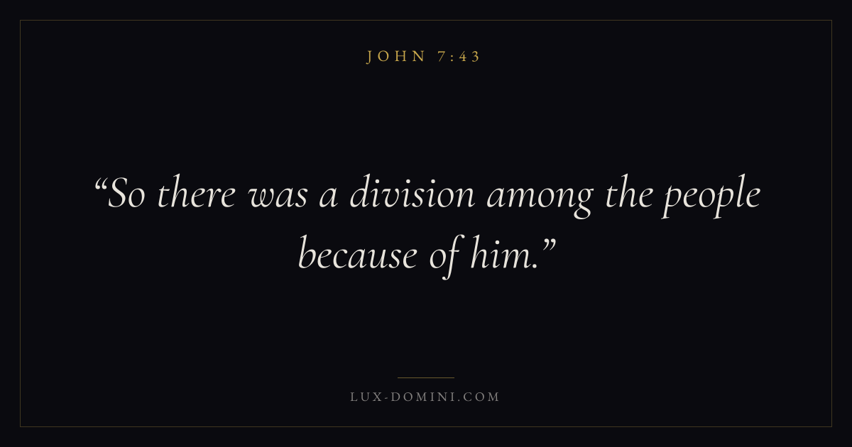 Books / John / Chapter 7 / Verse 43 ← John 7:42 John 7:43 John 7:44 → So there was a division among the people because of him. Download verse card Share on Twitter Share on Facebook Pin it ✦ Key themes LoveFaithWisdomGraceIncarnation Read with John 7:40John 7:41John 3:161 Corinthians 13:4 Related topics Bible verses about loveBible verses about faithBible verses about wisdomBible verses about grace ✦ John Chapter 7 verses V. 1 V. 2 V. 3 V. 4 V. 5 V. 6 V. 7 V. 8 V. 9 V. 10 V. 11 V. 12 V. 13 V. 14 V. 15 V. 16 V. 17 V. 18 V. 19 V. 20 V. 21 V. 22 V. 23 V. 24 V. 25 V. 26 V. 27 V. 28 V. 29 V. 30 V. 31 V. 32 V. 33 V. 34 V. 35 V. 36 V. 37 V. 38 V. 39 V. 40 V. 41 V. 42 V. 43 V. 44 V. 45 V. 46 V. 47 V. 48 V. 49 V. 50 V. 51 V. 52 V. 53