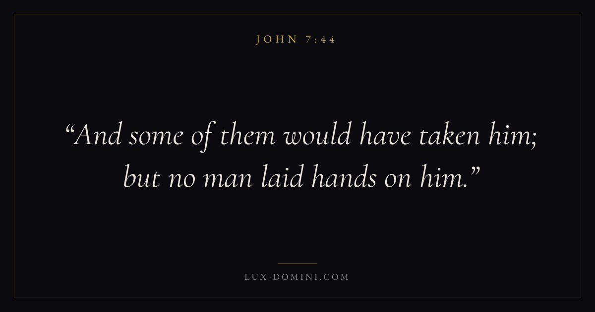 Books / John / Chapter 7 / Verse 44 ← John 7:43 John 7:44 John 7:45 → And some of them would have taken him; but no man laid hands on him. Download verse card Share on Twitter Share on Facebook Pin it ✦ Key themes LoveFaithWisdomGraceIncarnation Read with John 7:40John 7:41John 3:161 Corinthians 13:4 Related topics Bible verses about loveBible verses about faithBible verses about wisdomBible verses about grace ✦ John Chapter 7 verses V. 1 V. 2 V. 3 V. 4 V. 5 V. 6 V. 7 V. 8 V. 9 V. 10 V. 11 V. 12 V. 13 V. 14 V. 15 V. 16 V. 17 V. 18 V. 19 V. 20 V. 21 V. 22 V. 23 V. 24 V. 25 V. 26 V. 27 V. 28 V. 29 V. 30 V. 31 V. 32 V. 33 V. 34 V. 35 V. 36 V. 37 V. 38 V. 39 V. 40 V. 41 V. 42 V. 43 V. 44 V. 45 V. 46 V. 47 V. 48 V. 49 V. 50 V. 51 V. 52 V. 53