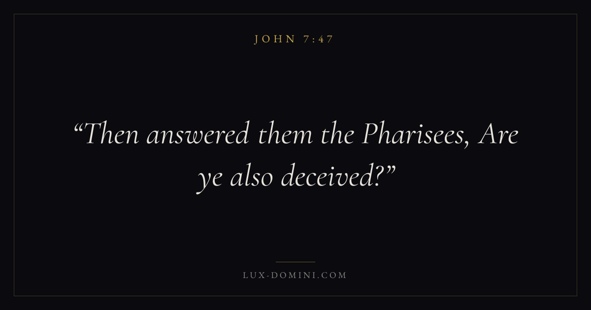 Books / John / Chapter 7 / Verse 47 ← John 7:46 John 7:47 John 7:48 → Then answered them the Pharisees, Are ye also deceived? Download verse card Share on Twitter Share on Facebook Pin it ✦ Key themes LoveFaithWisdomGraceIncarnation Read with John 7:45John 7:46John 3:161 Corinthians 13:4 Related topics Bible verses about loveBible verses about faithBible verses about wisdomBible verses about grace ✦ John Chapter 7 verses V. 1 V. 2 V. 3 V. 4 V. 5 V. 6 V. 7 V. 8 V. 9 V. 10 V. 11 V. 12 V. 13 V. 14 V. 15 V. 16 V. 17 V. 18 V. 19 V. 20 V. 21 V. 22 V. 23 V. 24 V. 25 V. 26 V. 27 V. 28 V. 29 V. 30 V. 31 V. 32 V. 33 V. 34 V. 35 V. 36 V. 37 V. 38 V. 39 V. 40 V. 41 V. 42 V. 43 V. 44 V. 45 V. 46 V. 47 V. 48 V. 49 V. 50 V. 51 V. 52 V. 53